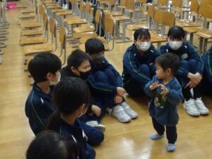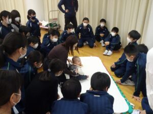 次に、赤ちゃんを育てているお母さんたちへ、インタビューを行いました。以前、妊婦ジャケットを着用して妊婦体験をしたり、赤ちゃん人形を抱っこしたりする活動を行った際に気になったことを、次々と質問していました。妊娠、出産、育児の大変さや楽しさ、赤ちゃんの生活や成長の様子等、妊娠中・育児中のお母さんの生の声に、子供たちは興味津々な様子でした。また、赤ちゃんを近くで見たり、触れ合ったりすることができ、たくさん笑顔を見せていました。赤ちゃんを見つめる視線はどの子もとても温かく、幸せそうでした。