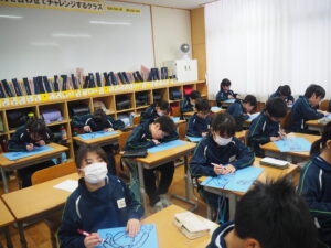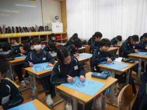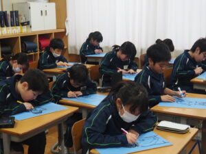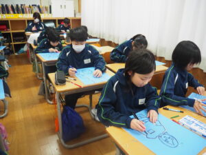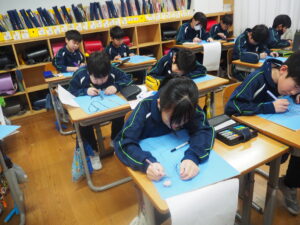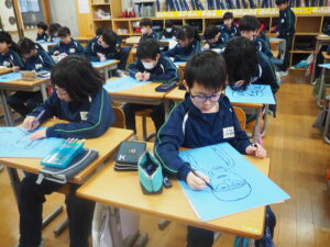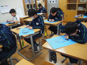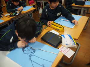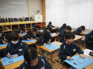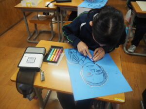 図画工作科の授業では、自画像の版画作りに取り組んでいます。「○○する自分」を版画で表現しようと、彫刻刀で掘り進めています。どんな作品になるか楽しみです。